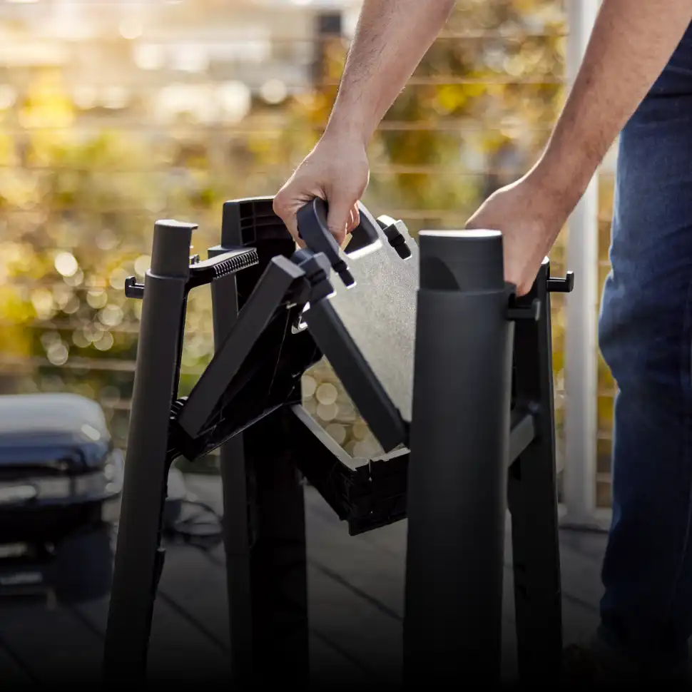 Support pliable livré avec une tablette amovible : idéal pour cuisiner confortablement sur le barbecue LUMIN . Se replie très facilement pour un rangement optimal dans un petit espace.