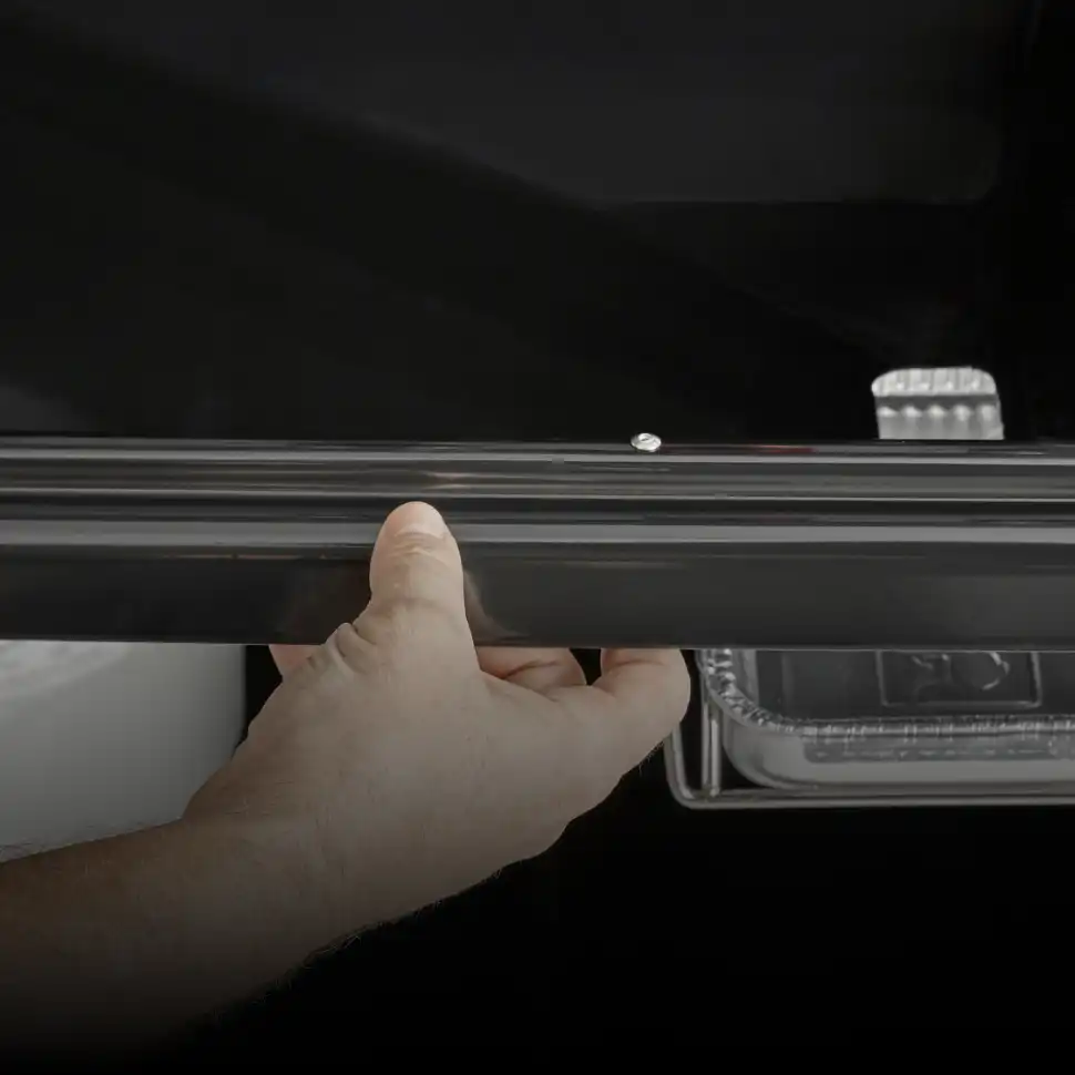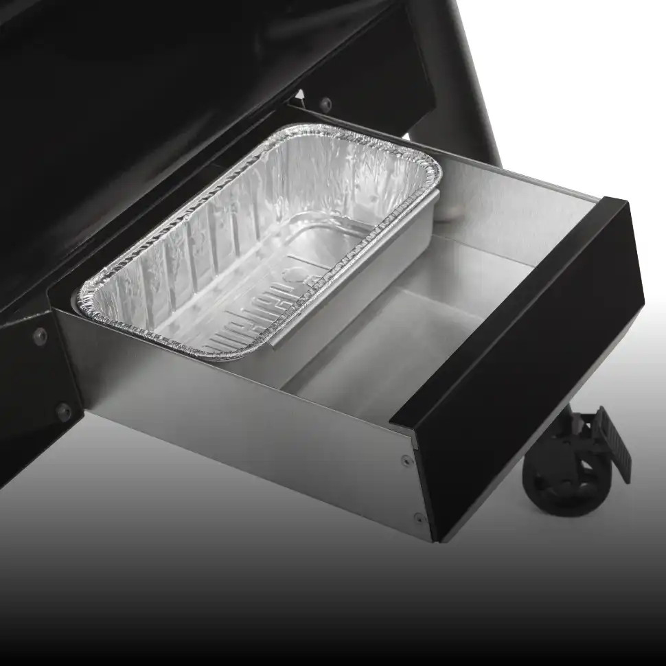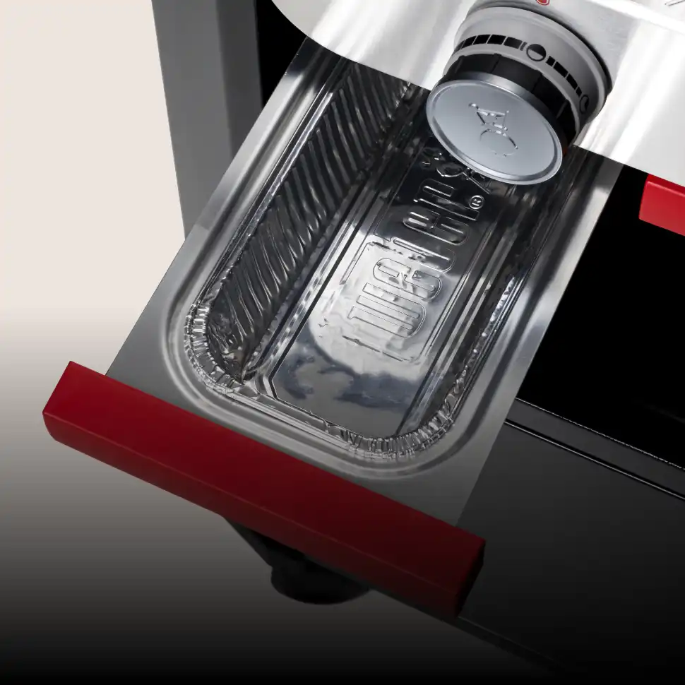 Contribue à éliminer la graisse qui s’accumule et évite les flambées soudaines. La graisse est évacuée dans une barquette à l’intérieur du bac de récupération des graisses, situé sous la cuve.